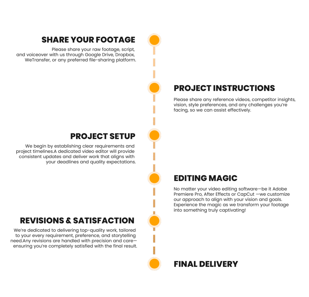 Our optimized editing service process is designed to make your workflow efficient and hassle-free. From submitting raw footage to receiving polished videos, our approach ensures you save time while achieving outstanding results. Focus on your vision, and let us handle the editing!